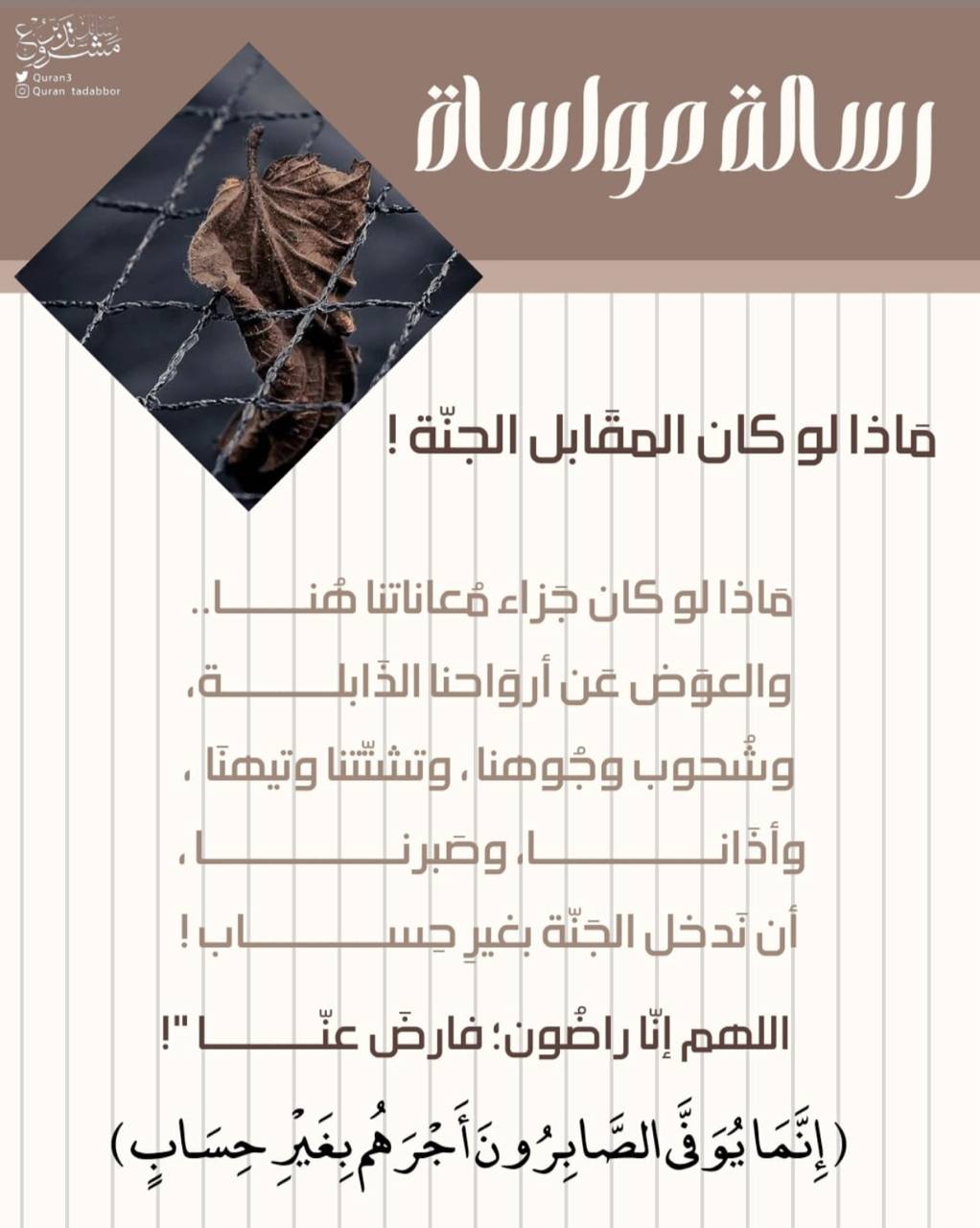مَاذا لو كان جَزاء مُعاناتنا هُنا.. والعوَض عَن أروَاحنا الذَابلة، وشُحوب وجُوهنا، وتشتّتنا وتيهنَا، وأذَانا، وصَبرنا، أن نَدخل الجَنّة بغيرِ حِساب !