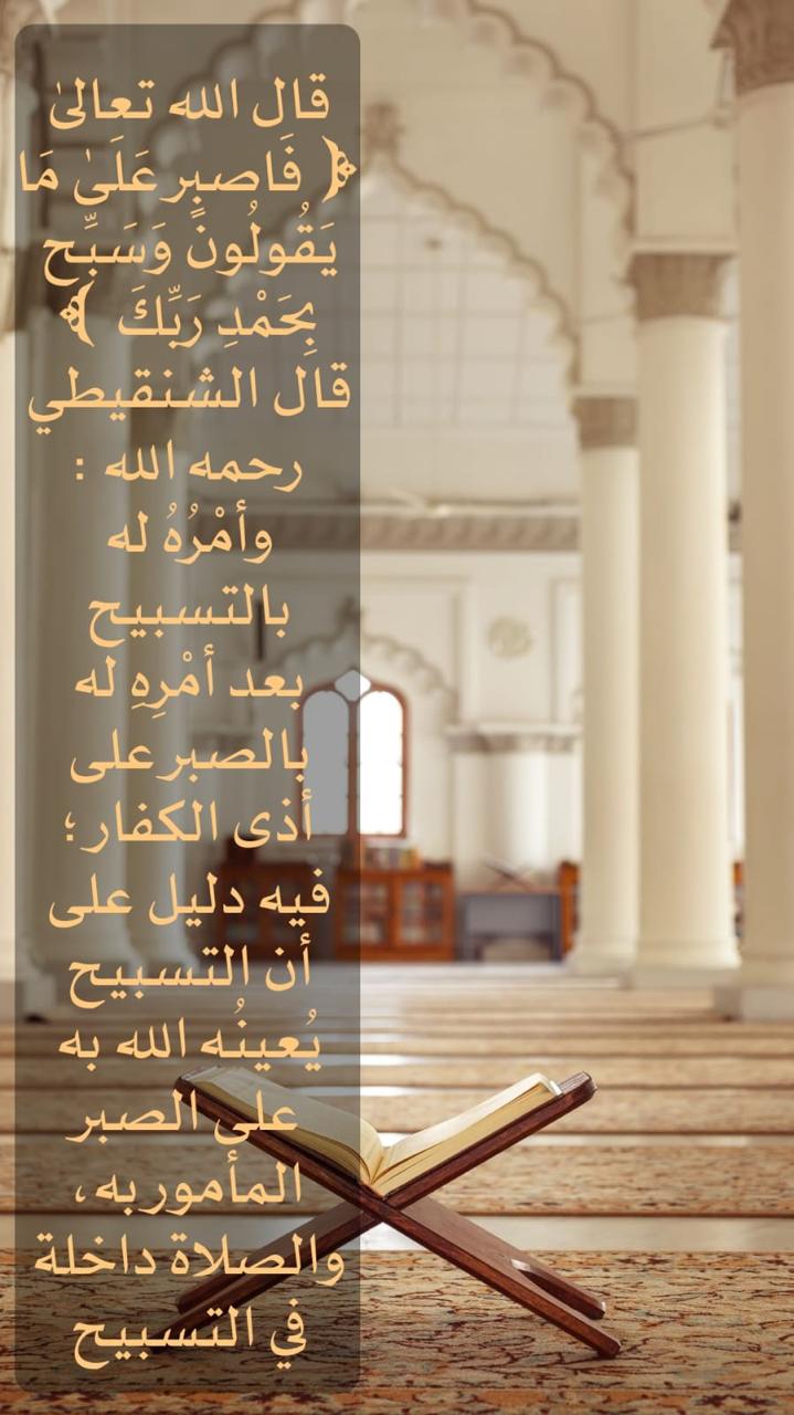 • وأمره له بالتسبيح بعد أمره له بالصبر على أذى الكفار؛ فيه دليل على أن التسبيح يعينه الله به على الصبر المأمور به، والصلاة داخلة في التسبيح.