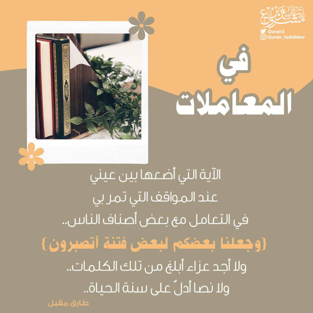 الآية التي أضعها بين عيني عند المواقف التي تمر بي في التعامل مع بعض أصناف الناس.. ﴿وجعلنا بعضكم لبعض فتنة؛ أتصبرون؟﴾.. ولا أجد عزاء أبلغ من تلك الكلمات.. ولا نصا أدلّ على سنة الحياة.