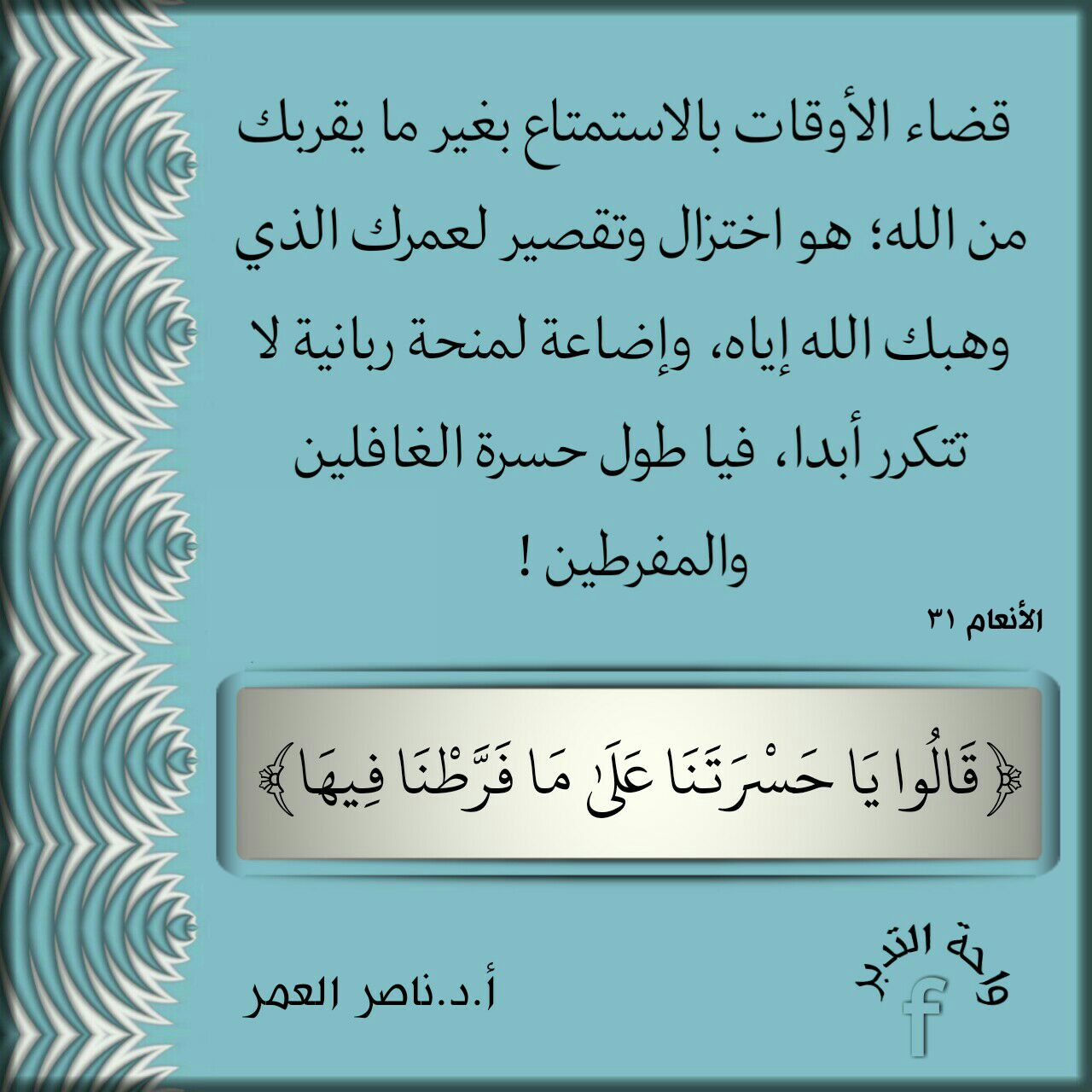 قضاء الأوقات بالاستمتاع بغير ما يقربك من الله؛ هو اختزال وتقصير لعمرك الذي وهبك الله إياه، وإضاعة لمنحة ربانية لا تتكرر أبدا، فيا طول حسرة الغافلين والمفرطين!.