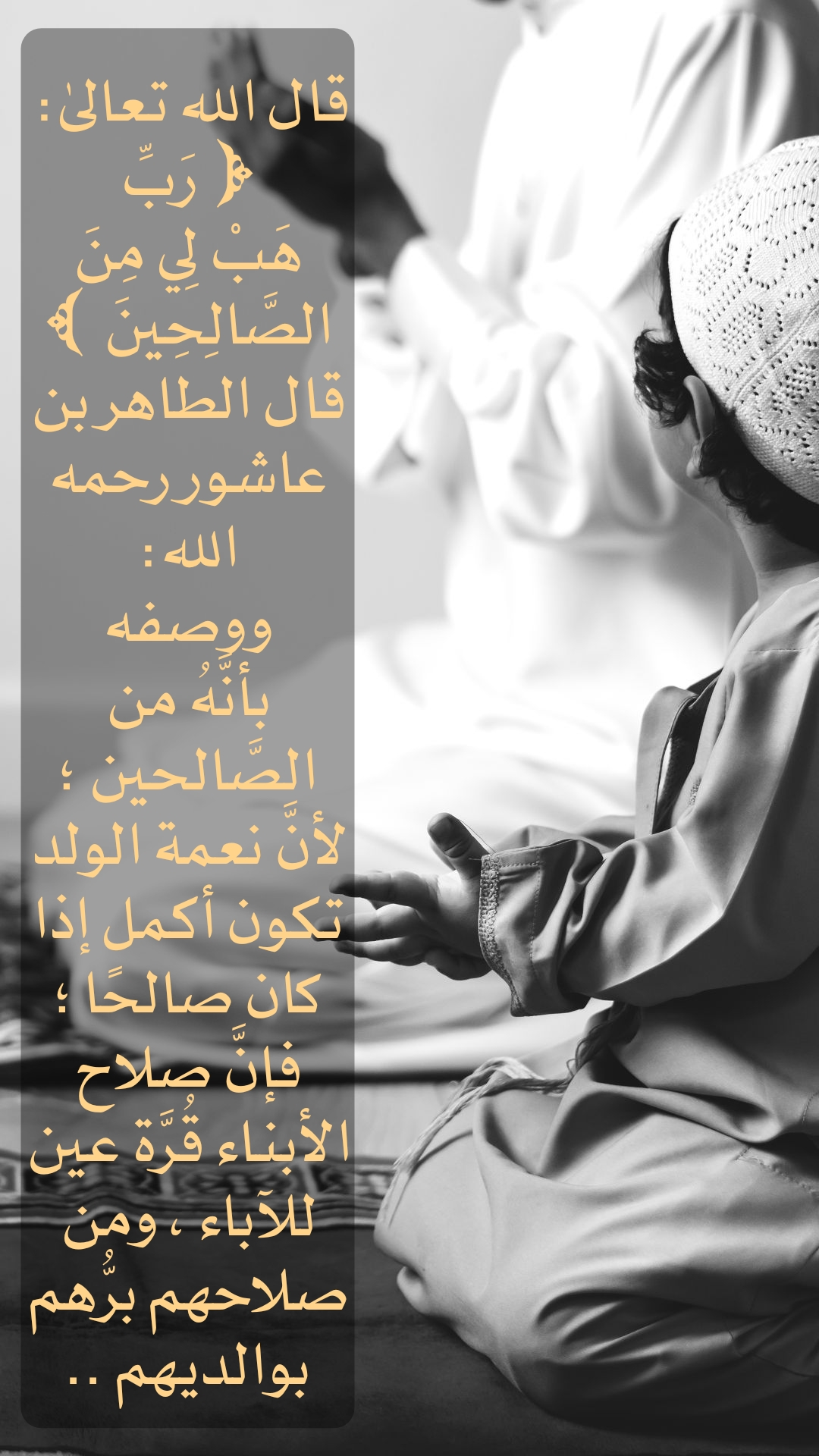 ﴿رَبِّ هَبْ لِي مِنَ الصَّالِحِينَ ﴾ • ووصفه بأنه من الصالحين ؛ لأن نعمة الولد تكون أكمل إذا كان صالحًا ؛ فإن صلاح الأبناء قرة عين للآباء ، ومن صلاحهم برّهم بوالديهم.