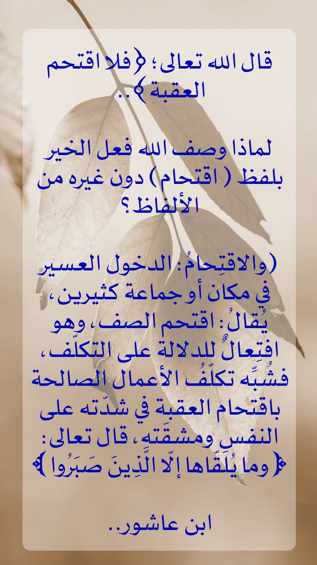قال الله تعالى : ( فلا اقتحم العقبة) لماذا وصف الله فعل الخير بلفظ ( اقتحام ) دون غيره من الألفاظ ؟ والاقتحام : الدخول العسير في مكان أو جماعة كثيرين يقال : اقتحم الصف، وهو افتعال للدلالة على التكلف ف... المزيد