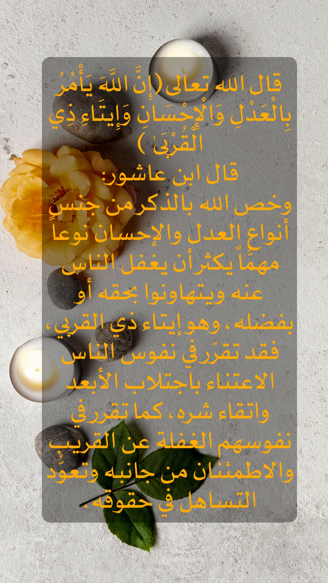قال الله تعالى ( إِنَّ اللَّهَ يَأْمُرُ بالْعَدْلِ وَالْإِحْسَانِ وَإِيتَاءِ ذِي القربى ) قال ابن عاشور: وخص الله بالذكر من جنس أنواع العدل والإحسان نوعاً مهمّاً يكثر أن يغفل الناس عنه ويتهاونوا بحقه ... المزيد