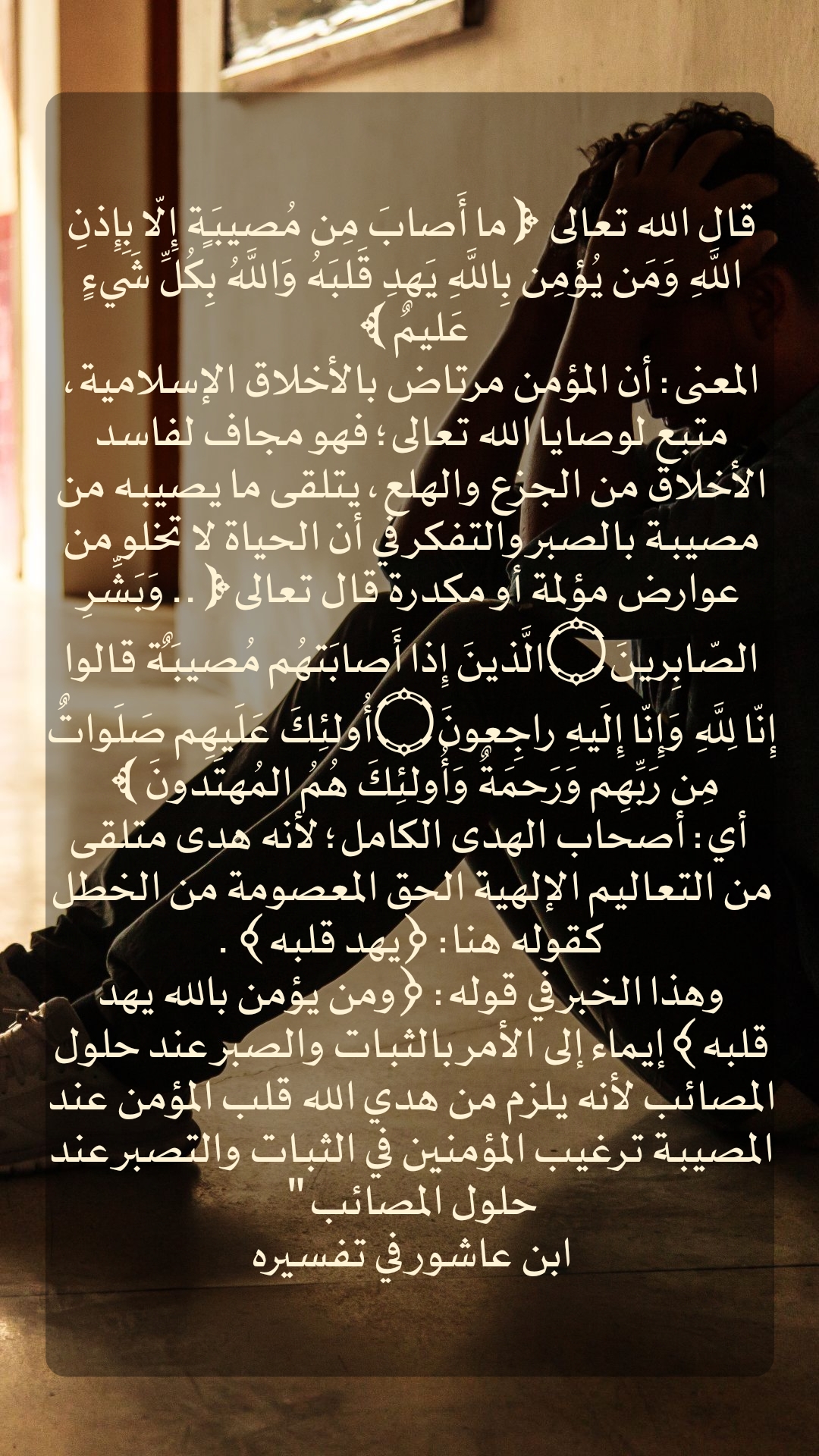 قال الله تعالى( ما أَصابَ مِن مُصِيبَةٍ إِلَّا بِإِذْنِ اللَّهِ وَمَن يُؤْمِن بِاللَّهِ يَهْدِ قَلْبَهُ وَاللَّهُ بِكُلِّ شَيْءٍ عَلِيمٌ ) المعنى : أن المؤمن مرتاض بالأخلاق الإسلامية متبع لوصايا الله ... المزيد