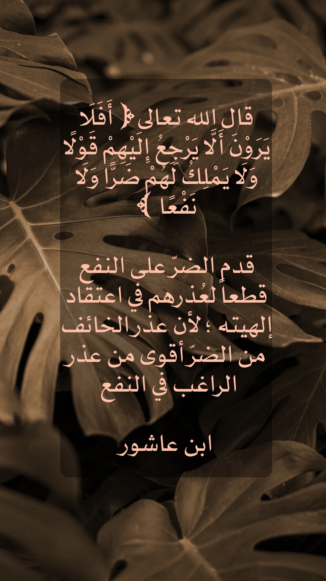 قال الله تعالى ( أَفَلَا يَرَوْنَ أَلَّا يَرْجِعُ إِلَيْهِمْ قَوْلًا وَلَا يَمْلِكُ لَهُمْ ضَرًّا وَلَا نَفْعًا ) قدم الضر على النفع قطعاً لعذرهم في اعتقاد قطعاً إلهيته ؛ لأن عذر الخائف من الضر أقوى من عذر الراغب في النفع.