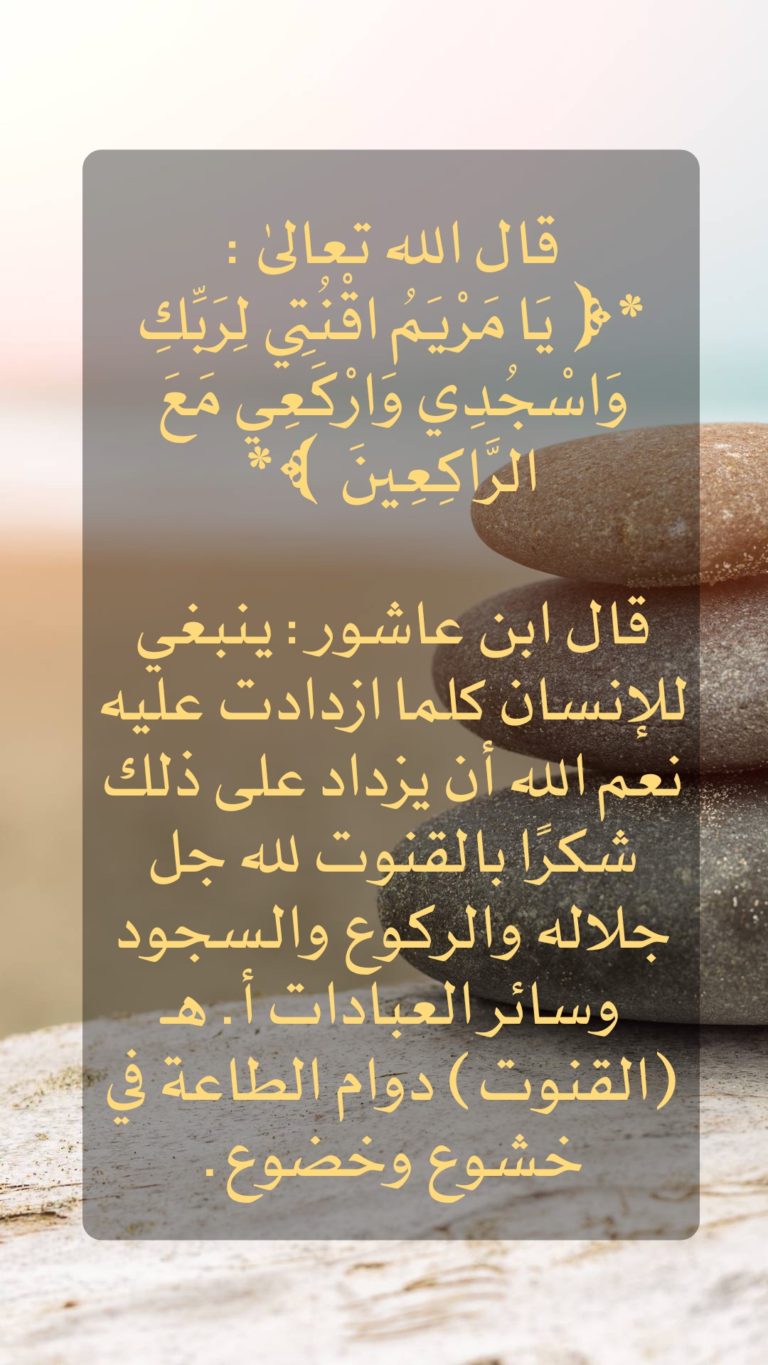 قال الله تعالى : * (يَا مَرْيَمُ اقْنَتِي لِرَبِّكِ وَاسْجُدِي وَارْكَعِي مَعَ الرَّاكِعِينَ )* قال ابن عاشور : ينبغي للإنسان كلما ازدادت عليه نعم الله أن يزداد على ذلك شكرا بالقنوت لله جل جلاله والركوع والسجود وسائر العبادات أ.هـ (القنوت ) دوام الطاعة في خشوع وخضوع