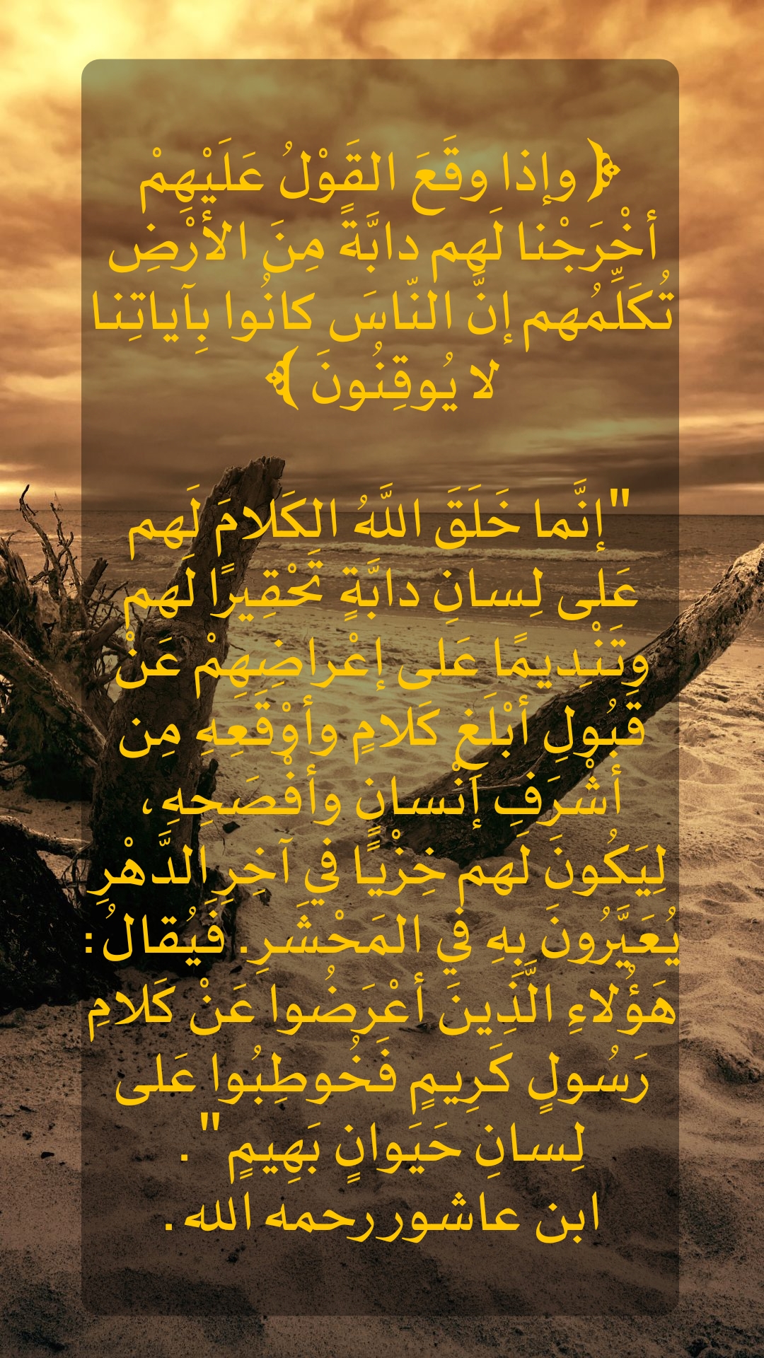 (وإِذا وقَعَ القَوْلُ عَلَيْهِمْ أخْرَجْنَا لَهِم دَابَّةً مِنَ الْأَرْضِ تُكَلِّمُهُم إِنَّ النَّاسَ كَانُوا بِآيَاتِنَا لا يُوقِنُونَ ) " إِنَّمَا خَلَقَ اللَّهُ الكَلامَ لَهُم على لسان دابة تحقيرا ... المزيد