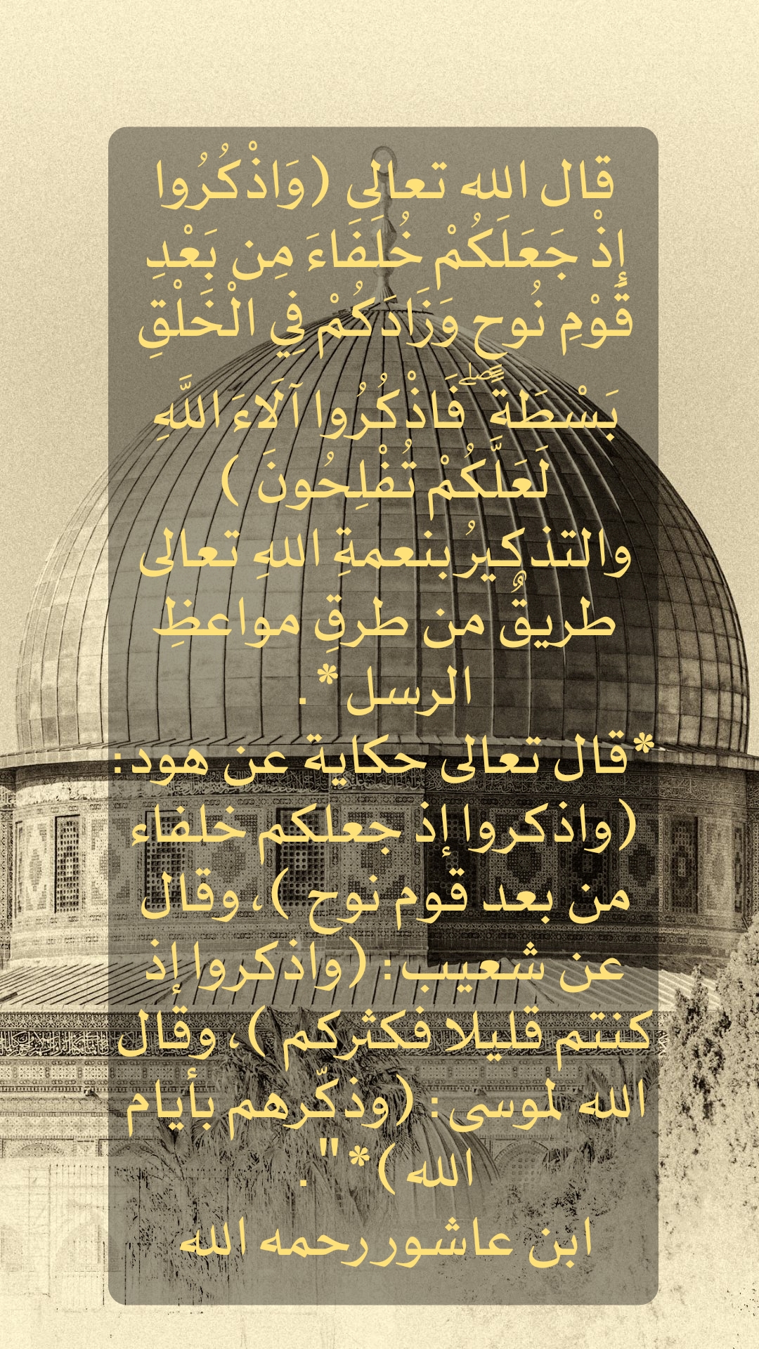 قال الله تعالى (وَاذْكُرُوا إِذْ جَعَلَكُمْ خُلَفَاءَ مِن بَعْدِ قَوْمِ نُوحٍ وَزَادَكُمْ فِي الْخَلْقِ بَسْطَةً فَاذْكُرُوا آلَاءَ اللَّهِ لَعَلَّكُمْ تُفْلِحُونَ ) والتذكير بنعمةِ اللهِ تعالى طريق ... المزيد
