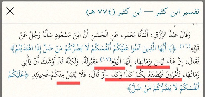 ج/ يقصد عبدالله بن مسعود رضي الله عنه إن زمنه ليس زمان تحقق هذه الآية وترك الأمر بالمعروف والنهي عن المنكر لأن الحق قائم والإسلام ظاهر، ولكنه يأتي على الناس ز... المزيد