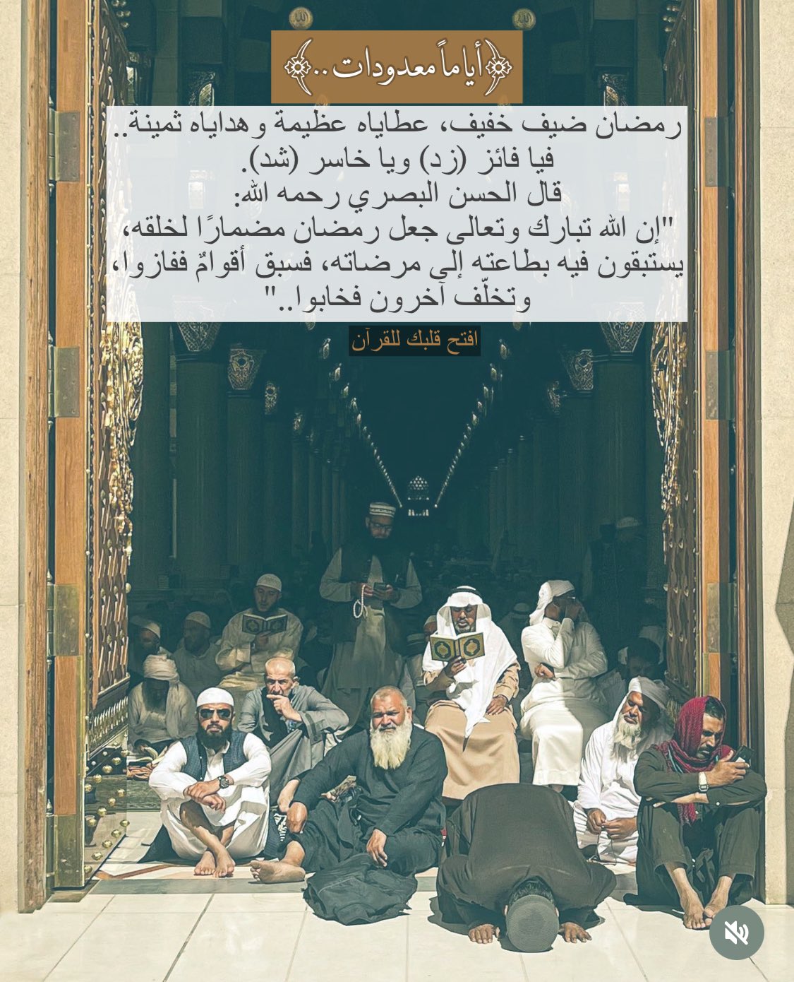 ﴿أَيَّامًا مَّعْدُودَاتٍ﴾: رمضان ضيف خفيف، عطاياه عظيمة وهداياه ثمينة. فيا فائز (زد) ويا خاسر (شد). قال الحسن البصري رحمه الله: "إن الله تبارك وتعالى جعل رمضان مضمارًا لخلقه، يستبقون فيه بطاعته إلى مرضاته، فسبق أقوام ففازوا، وتخلّف آخرون فخابوا..".