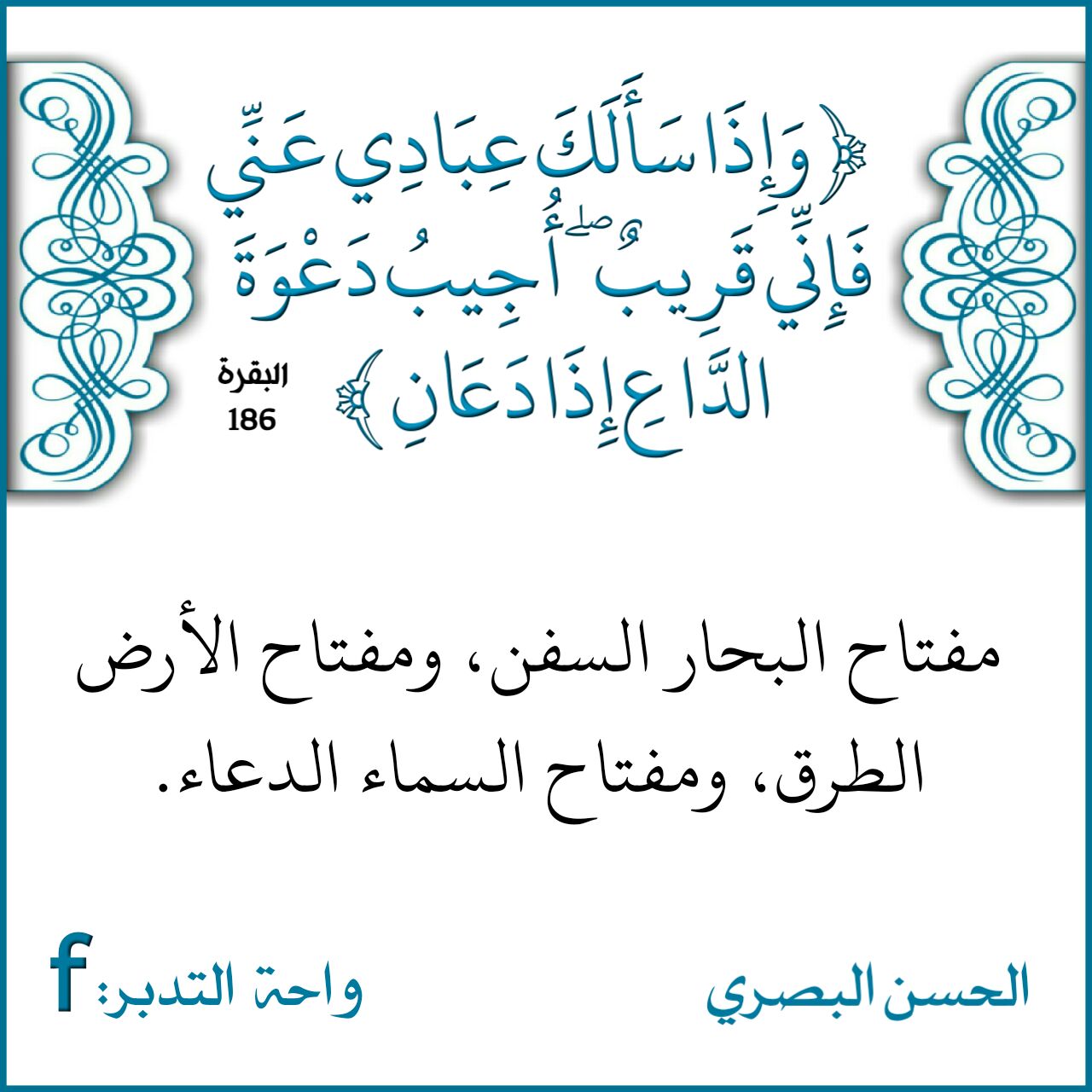 ﴿وَإِذَا سَأَلَكَ عِبَادِي عَنِّي فَإِنِّي قَرِيبٌ أُجِيبُ دَعْوَةَ الدَّاعِ إِذَا دَعَانِ﴾: مفتاح البحار السفن، ومفتاح الأرض الطرق، ومفتاح السماء الدعاء.