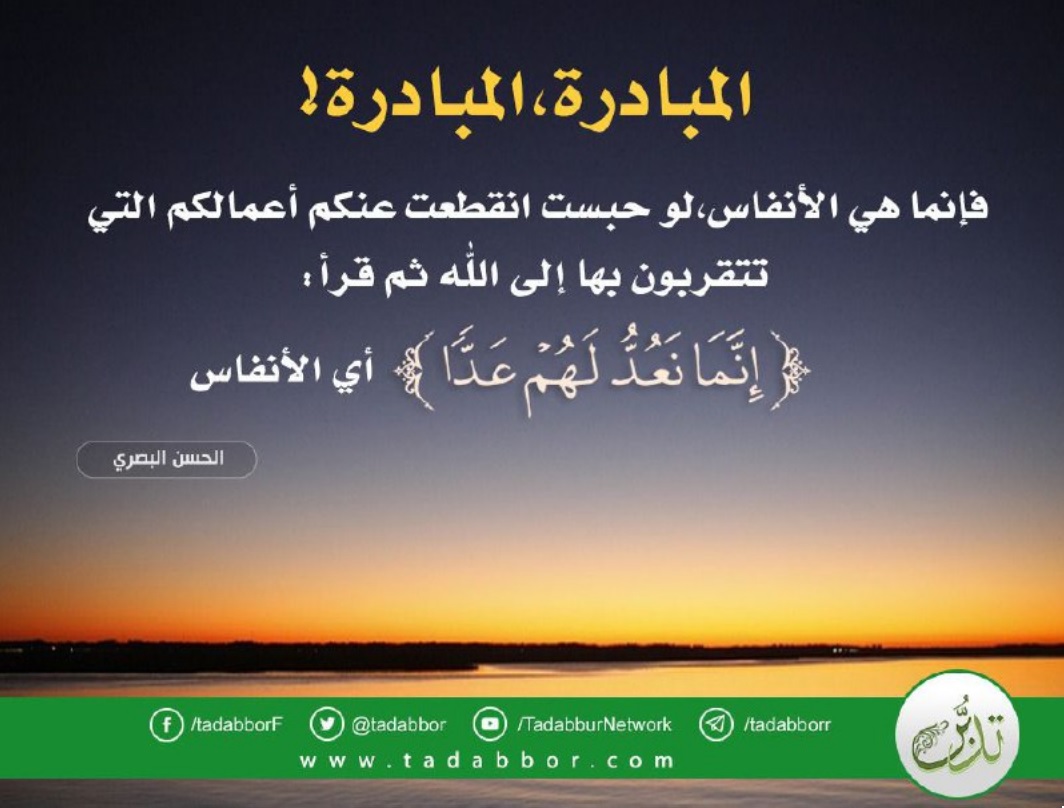 المبادرة، المبادرة! فإنما هي الأنفاس، لو حبست انقطعت عنكم أعمالكـم التي تتقربـون بهـا إلى الله ثم قـرأ: ﴿ إِنَّمَا نَعُدُّ لَهُمْ عَدًّا ﴾ أي الأنفاس.