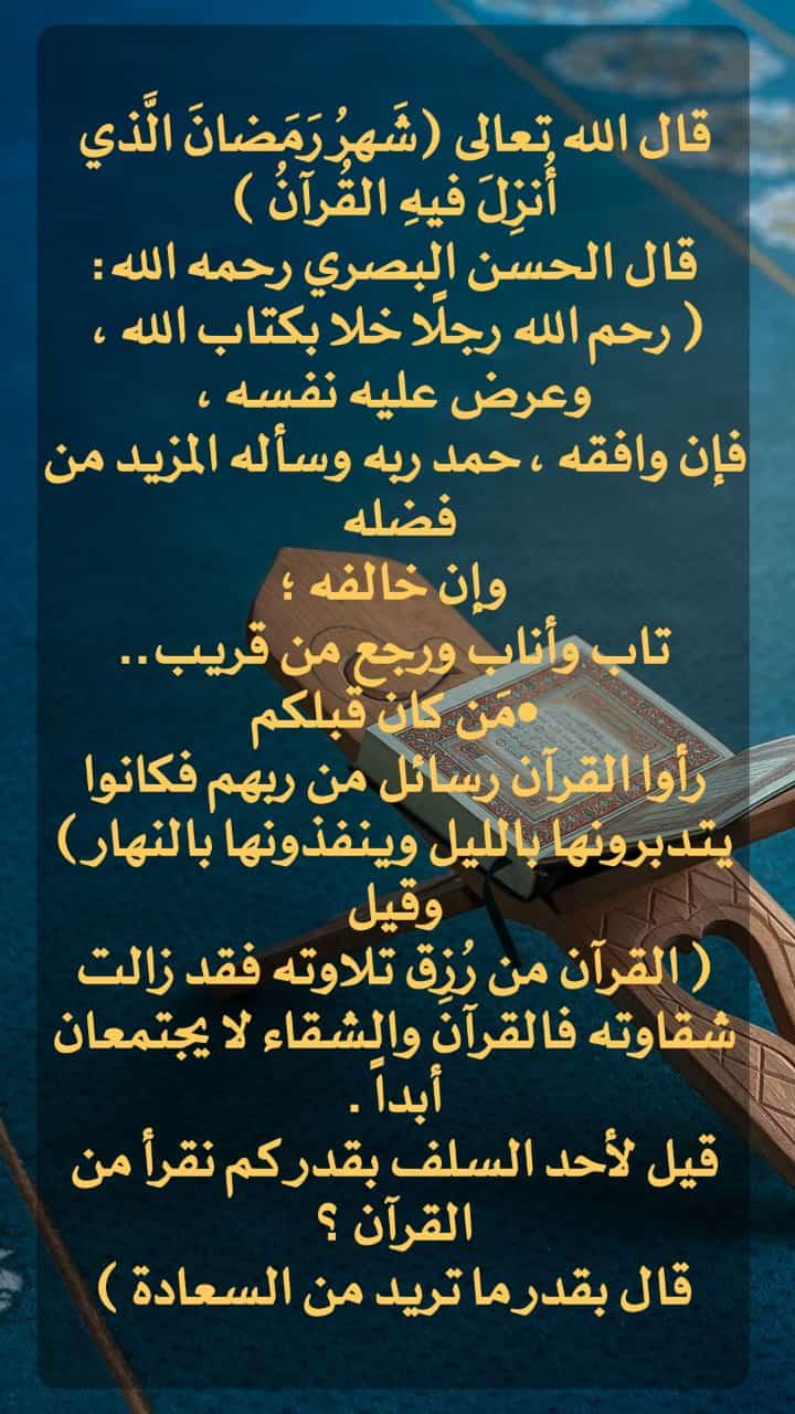 • رحم الله رجلا خلا بكتاب الله، وعرض عليه نفسه، فإن وافقه، حمد ربه وسأله المزيد من فضله وإن خالفه ؛ تاب وأناب ورجع من قريب..