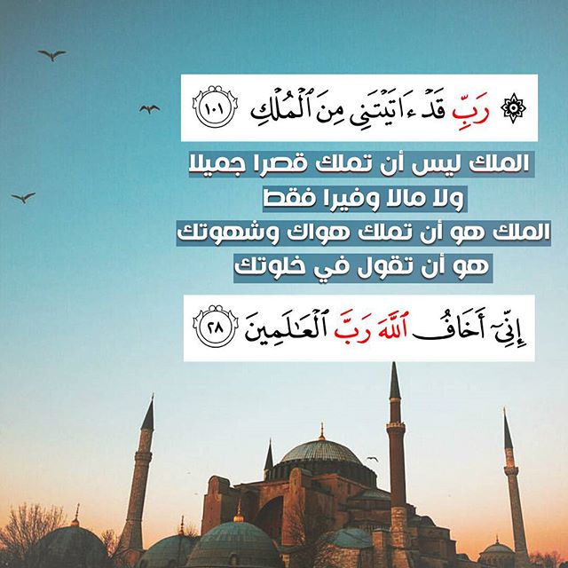 ﴿ رَبِّ قَدْ آتَيْتَنِي مِنَ الْمُلْكِ وَعَلَّمْتَنِي مِن تَأْوِيلِ الْأَحَادِيثِ فَاطِرَ السَّمَاوَاتِ وَالْأَرْضِ أَنتَ وَلِيِّي فِي الدُّنْيَا وَالْآخِرَةِ تَوَفَّنِي مُسْلِمًا وَأَلْحِقْنِي بِالصَّالِحِينَ ﴿١٠١﴾ ﴾