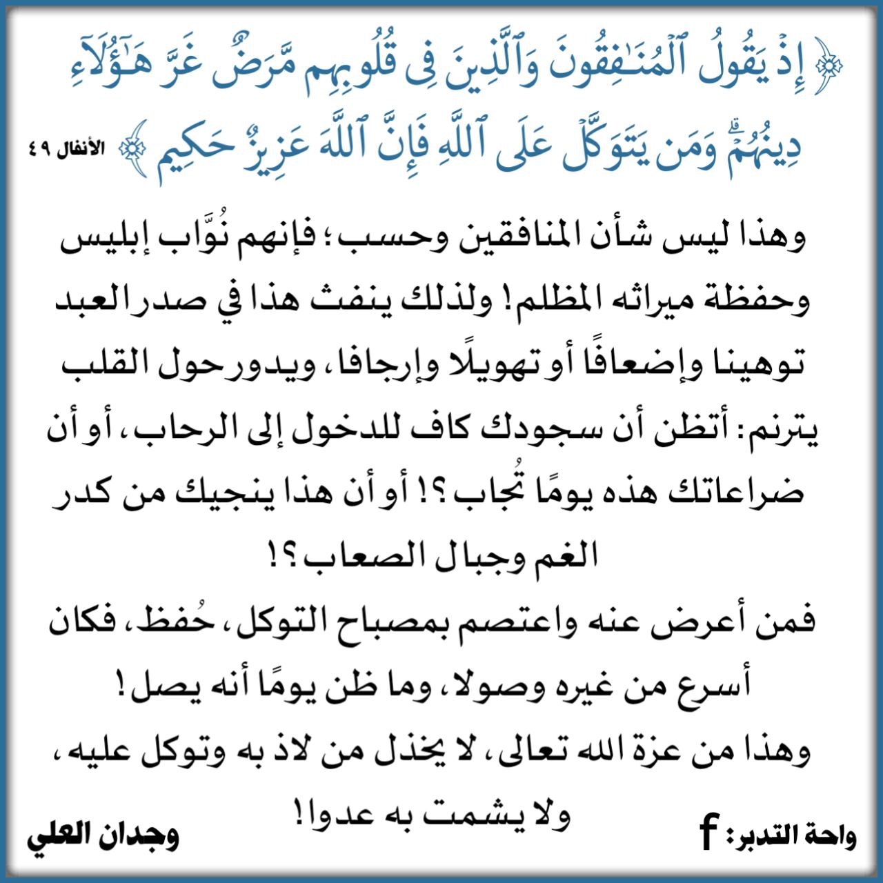 ﴿إِذْ يَقُولُ الْمُنَافِقُونَ وَالَّذِينَ فِي قُلُوبِهِم مَّرَضٌ غَرَّ هَؤُلَاءِ دِينُهُمْ وَمَن يَتَوَكَّلْ عَلَى اللَّهِ فَإِنَّ اللَّهَ عَزِيزٌ حَكِيمٌ﴾