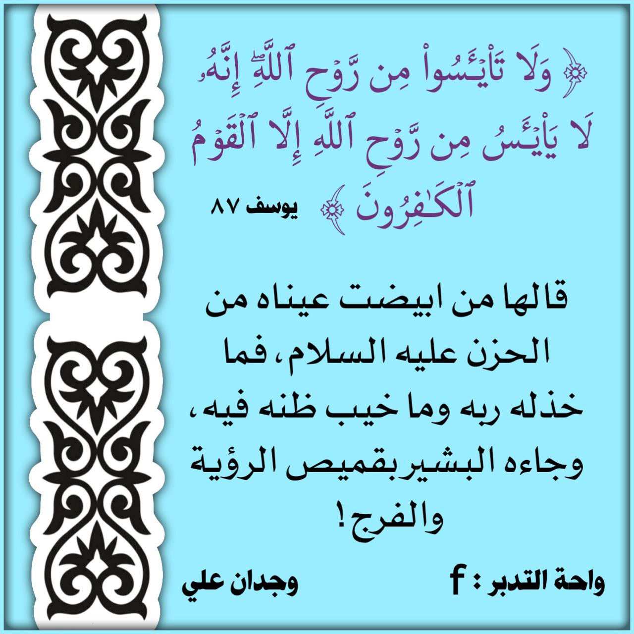 ﴿وَلَا تَيْئَسُوا مِن رَّوْحِ اللَّهِ إِنَّهُ لَا يَيْئَسُ مِن رَّوْحِ اللَّهِ إِلَّا الْقَوْمُ الْكَافِرُونَ﴾