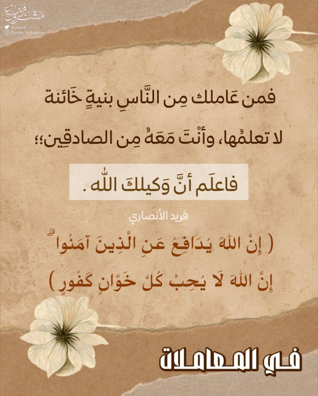 فمن عَاملك مِن النَّاسِ بنيةٍ خَائنة لا تعلمُها، وأنْتَ مَعَهُ مِن الصادقِين؛ فاعلَم أنَّ وَكيلكَ الله.