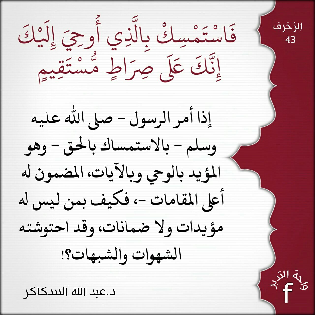 ﴿فَاسْتَمْسِكْ بِالَّذِي أُوحِيَ إِلَيْكَ إِنَّكَ عَلَى صِرَاطٍ مُّسْتَقِيمٍ﴾: