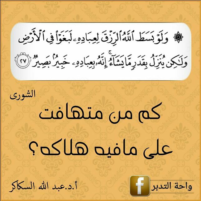 ﴿وَلَوْ بَسَطَ اللَّهُ الرِّزْقَ لِعِبَادِهِ لَبَغَوْا فِي الْأَرْضِ وَلَكِن يُنَزِّلُ بِقَدَرٍ مَّا يَشَاءُ إِنَّهُ بِعِبَادِهِ خَبِيرٌ بَصِيرٌ﴾: