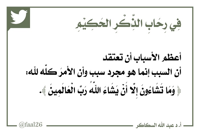 أعظم الأسباب أن تعتقد أن السبب إنما هو مجرد سبب وأن الأمرَ كلَّه لله: (وَمَا تَشَاءُونَ إِلَّا أَنْ يَشَاءَ اللَّهُ رَبُّ الْعَالَمِينَ).