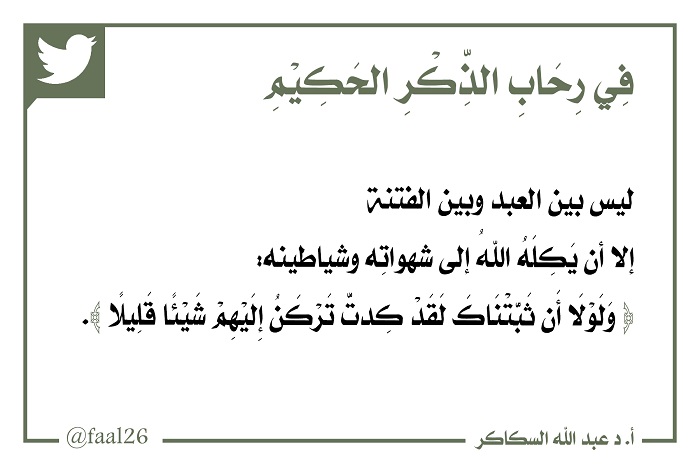 ليس بين العبد وبين الفتنة إلا أن يَكِلَهُ اللهُ إلى شهواتِه وشياطينه: (ولولا أن ثبتناك لقد كدت تركن إليهم شيئًا قليلا).