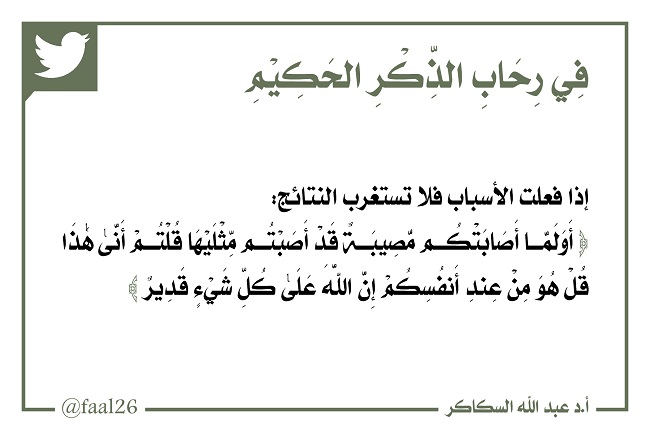 ﴿أَوَلَمَّا أَصَابَتْكُم مُّصِيبَةٌ قَدْ أَصَبْتُم مِّثْلَيْهَا قُلْتُمْ أَنَّى هَذَا قُلْ هُوَ مِنْ عِندِ أَنفُسِكُمْ إِنَّ اللَّهَ عَلَى كُلِّ شَيْءٍ قَدِيرٌ﴾: إذا فعلت الأسباب فلا تستغرب النتائج.