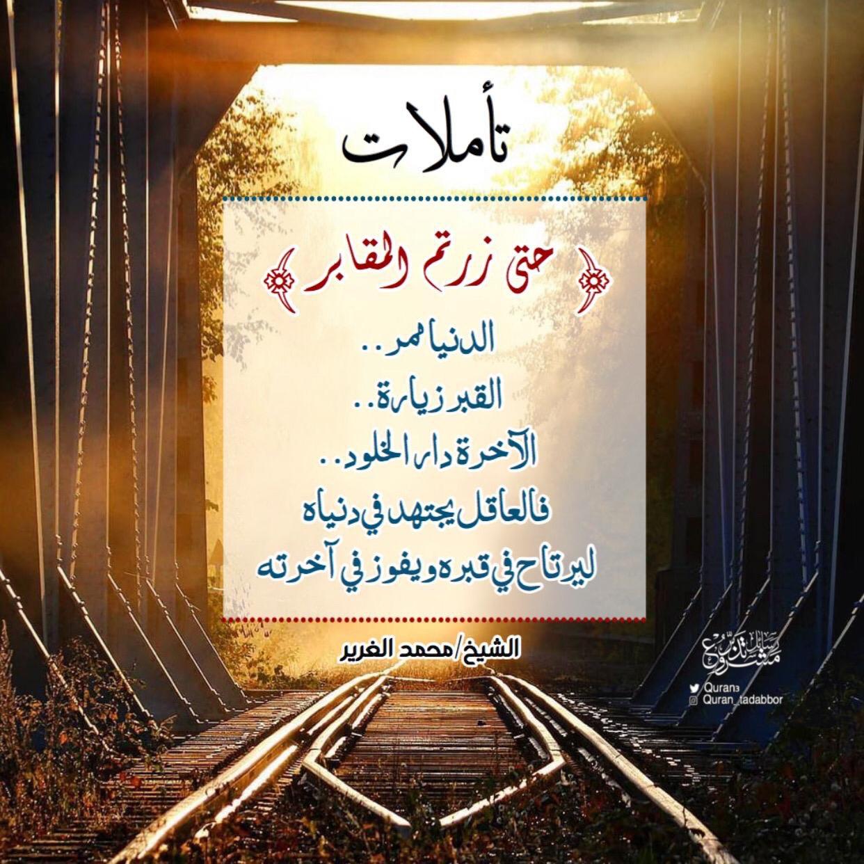 تأملات .. ‏{ حتى زرتم المقابر } ‏الدنيا ممر.. ‏القبر زيارة.. ‏الآخرة دار الخلود.. ‏فالعاقل يجتهد في دنياه ليرتاح في قبره ويفوز في آخرته.