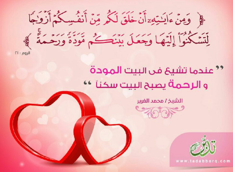 { وَمِنْ آيَاتِهِ أَنْ خَلَقَ لَكُم مِّنْ أَنفُسِكُمْ أَزْوَاجًا لِّتَسْكُنُوا إِلَيْهَا وَجَعَلَ بَيْنَكُم مَّوَدَّةً وَرَحْمَةً } : عندما تشيع في البيت المودة والرحمة يصبح البيت سكنًا.