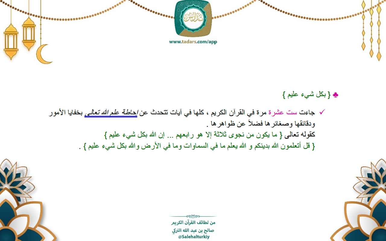 - جاءت ست عشرة مرة في القرآن الكريم ، كلها في آيات تتحدث عن إحاطة علم الله تعالى بخفايا الأمور ودقائقها وصغائرها فضلاً عن ظواهرها .
