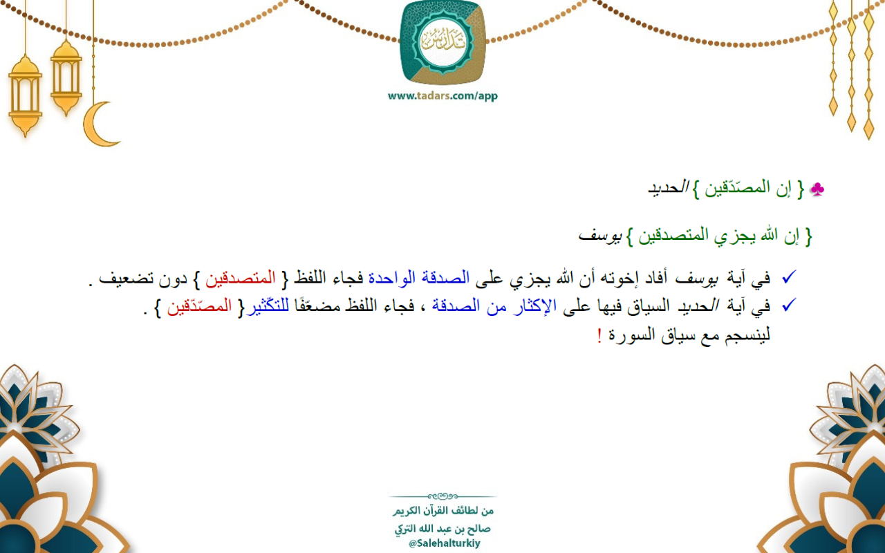 - في آية الحديد السياق فيها على الإكثار من الصدقة ، فجاء اللفظ مضعّفًا للتكّثير{ المصّدّقين } .
