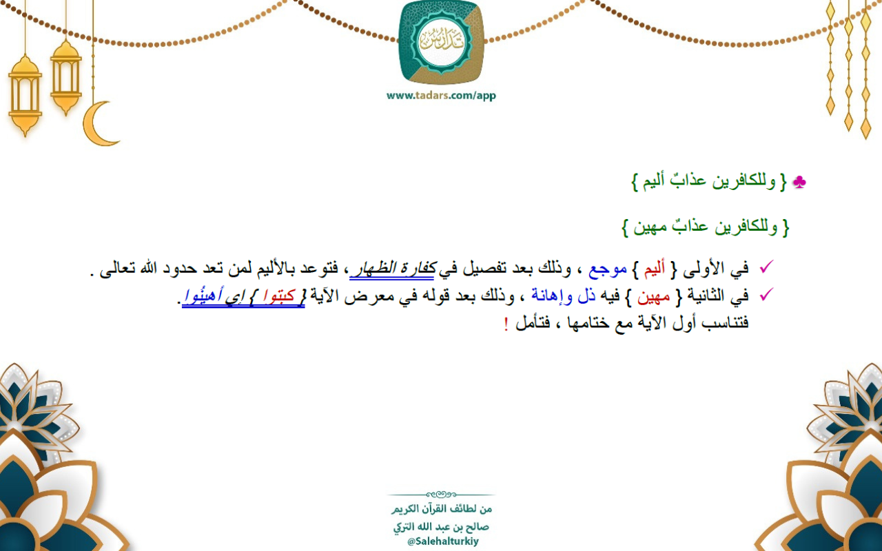 - في الأولى { أليم } موجع ، وذلك بعد تفصيل في كفارة الظهار، فتوعد بالأليم لمن تعد حدود الله تعالى .