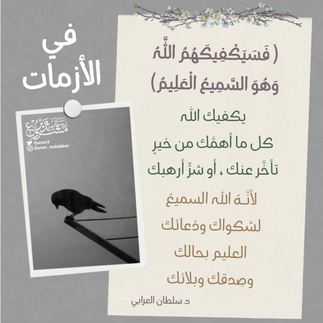 ﴿فَسَيَكْفِيكَهُمُ اللَّهُ وَهُوَ السَّمِيعُ الْعَلِيمُ﴾ يكفيك الله كل ما أهمَّك من خيرٍ تأخَّر عنك، أو شرٍّ أرهبك؛ لأنَّـهُ الله السميعُ لشكواك ودُعائك؛ العليم بحالك وصِدقك وبلائك.