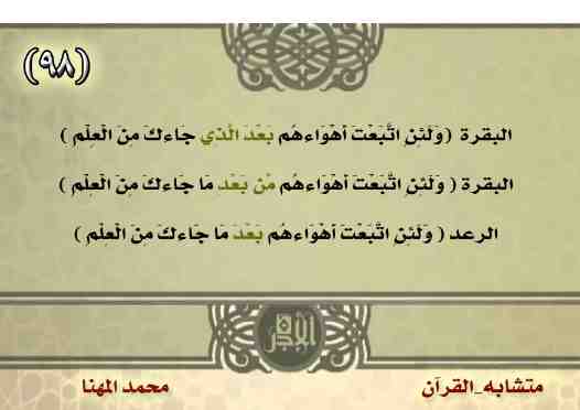 - ﴿وَلَئِنْ أَتَيْتَ الَّذِينَ أُوتُوا الْكِتَابَ بِكُلِّ آيَةٍ مَّا تَبِعُوا قِبْلَتَكَ وَمَا أَنتَ بِتَابِعٍ قِبْلَتَهُمْ وَمَا بَعْضُهُم بِتَابِعٍ قِبْلَةَ بَعْضٍ وَلَئِنِ اتَّبَعْتَ أَهْوَاءَهُم مِّن بَعْدِ مَا جَاءَكَ مِنَ الْعِلْمِ إِنَّكَ إِذًا لَّمِنَ الظَّالِمِينَ ﴿١٤٥﴾ ﴾ [البقرة آية:١٤٥]