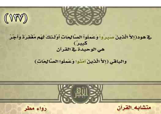- ﴿إِلَّا الَّذِينَ صَبَرُوا وَعَمِلُوا الصَّالِحَاتِ أُولَئِكَ لَهُم مَّغْفِرَةٌ وَأَجْرٌ كَبِيرٌ ﴿١١﴾ ﴾ [هود آية:١١]