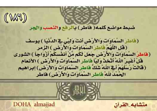 قد يختلط على البعض حركة الراء من كلمة" فاطر" في قوله تعالى:{...فاطر السّموات والأرض} وقد ورد في ست مواضع؛ جمعتها في هذه الكلمات: فاطر السّموات والأرض في ست كسرها أولًا بالأنعامِ إبراهيمَ فاطر وقل الشّورى جعل لكم من ضُمّت وفتحها لدى يوسفِ تنزيل الزّمر