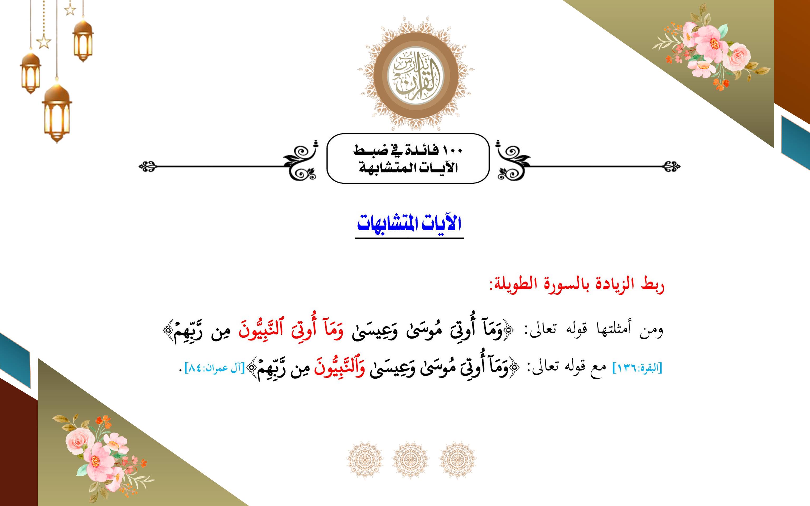 ومن أمثلتها قوله تعالى: ﴿وَمَا أُوتِيَ مُوسَى وَعِيسَى وَمَا أُوتِيَ النَّبِيُّونَ مِن رَّبِّهِمْ﴾ [البقرة: ١٣٦] مع قوله تعالى: ﴿وَمَا أُوتِيَ مُوسَى وَعِيسَى وَالنَّبِيُّونَ مِن رَّبِّهِمْ﴾ [آل عمران: ٨٤].