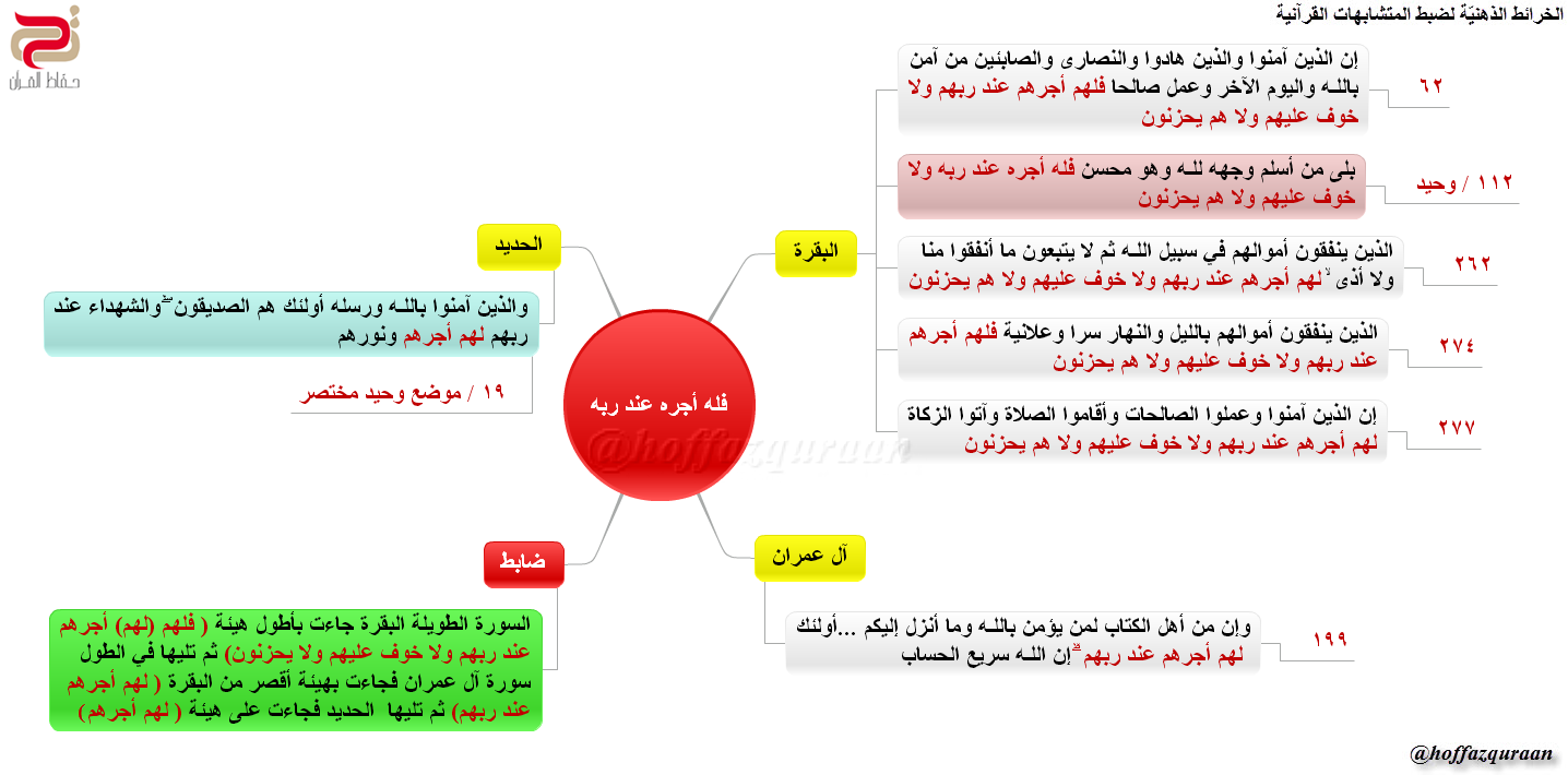 ▪ (الضابط): السورة الطويلة البقرة جاءت بأطول هيئة ﴿فلهم / (لهم) أجرهم عند ربهم ولا خوف عليهم ولا يحزنون﴾ ثم تليها في الطول سورة آل عمران فجاءت بهيئة أقصر من البقرة (لهم أجرهم عند ربهم) ثم تليها الحديد فجاءت على هيئة (لهم أجرهم).