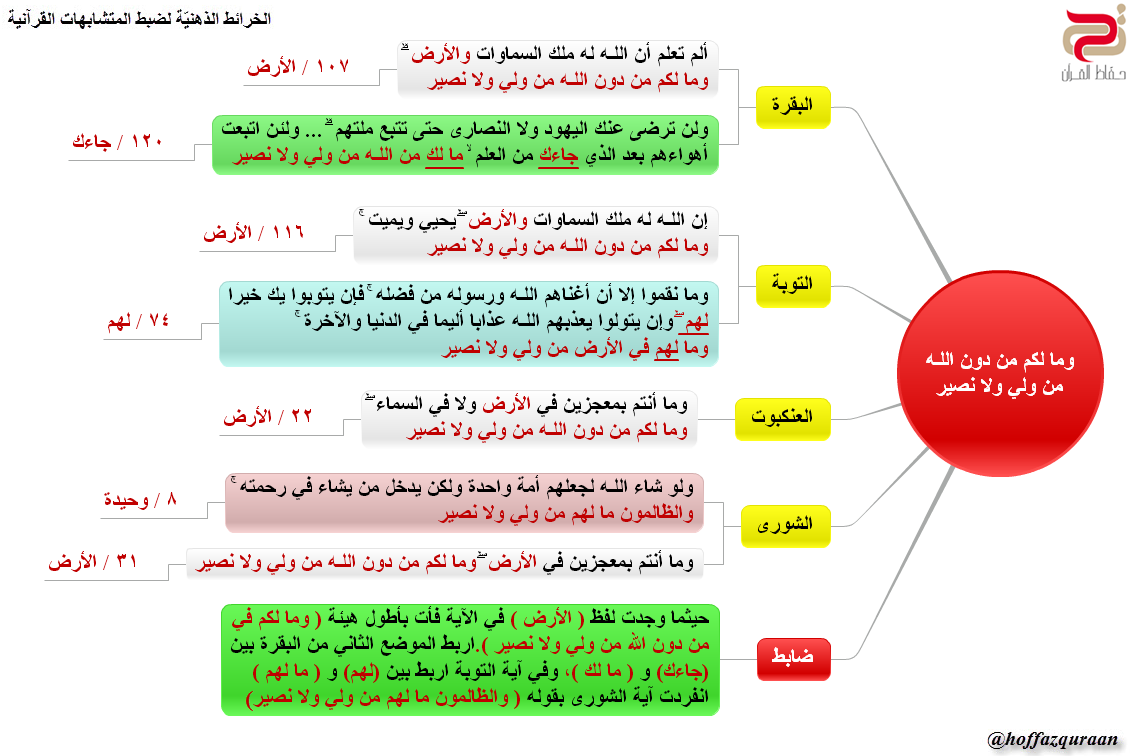 ▪ (الضابط): حيثما وجدت لفظ (الأرض) في الآية فأت بأطول هيئة (وَمَا لَكُم مِّن دُونِ اللَّهِ مِن وَلِيٍّ وَلَا نَصِيرٍ). اربط الموضع الثاني من البقرة بين (جَاءَكَ) و (مَا لَكَ)، وفي آية التوبة اربط بين (لَّهُمْ) و (مَا لَهُمْ) انفردت آية الشورى بقوله (وَالظَّالِمُونَ مَا لَهُم مِّن وَلِيٍّ وَلَا نَصِيرٍ).