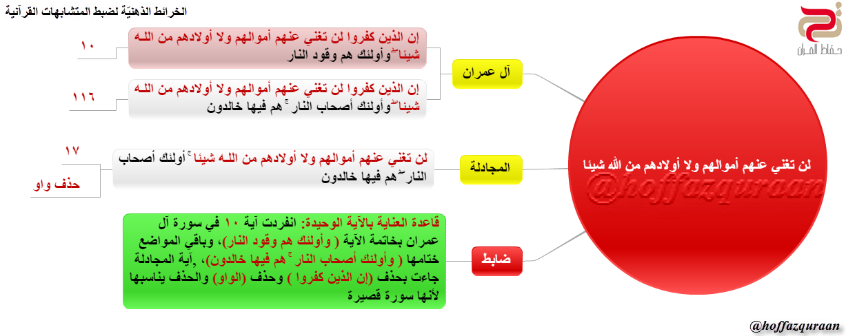 ▪ (الضابط): قاعدة (العناية بالآية الوحيدة): انفردت آية (١٠) في سورة آل عمران بخاتمة الآية (وأولئك هم وقود النار)، وباقي المواضع ختامها (وأولئك أصحاب النار هم فيها خالدون)، آية المجادلة جاءت بحذف (إن الذين كفروا) وحذف (الواو) والحذف يناسبها لأنها سورة قصيرة.