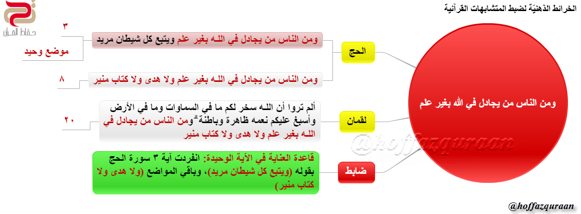 ▪ (الضابط): قاعدة (العناية في الآية الوحيدة): انفردت آية (٣) سورة الحج بقوله (ويتبع كل شيطان مريد)، وباقي المواضع (ولا هدى ولا كتاب منير).