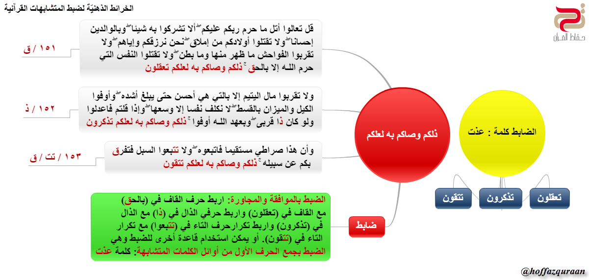 ▪ (الضابط): قاعدة (الضبط بالموافقة والمجاورة): اربط حرف القاف في (بالحق) مع القاف في (تعقلون) واربط حرفي الذال في (ذا) مع الذال في (تذكرون) واربط تكرار حرف التاء في (تتبعوا) مع تكرار التاء في (تتقون). أو يمكن استخدام قاعدة أخرى للضبط وهي (الضبط بجمع الحرف الأول من أوائل الكلمات المتشابهة): كلمة (عذت).