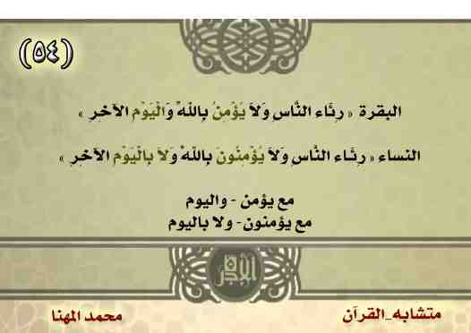 - ﴿وَالَّذِينَ يُنفِقُونَ أَمْوَالَهُمْ رِئَاءَ النَّاسِ وَلَا يُؤْمِنُونَ بِاللَّهِ وَلَا بِالْيَوْمِ الْآخِرِ وَمَن يَكُنِ الشَّيْطَانُ لَهُ قَرِينًا فَسَاءَ قَرِينًا ﴿٣٨﴾ ﴾ [النساء آية:٣٨]