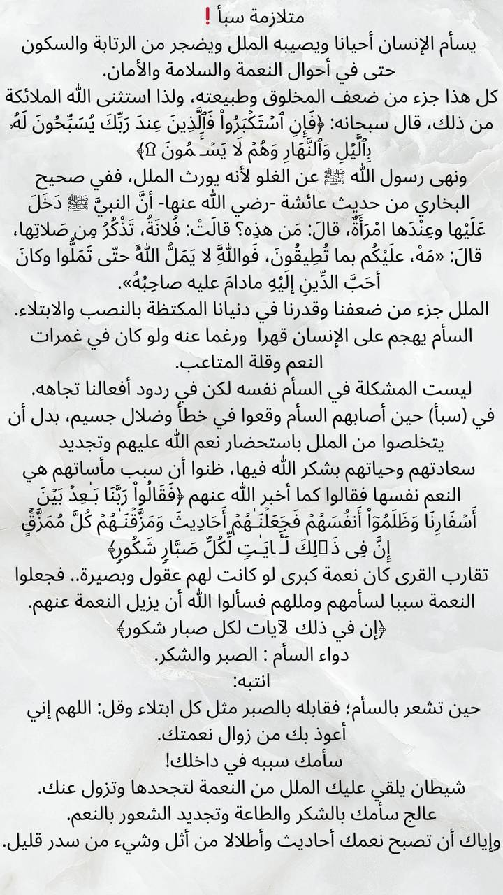 ﴿فَقَالُوا۟ رَبَّنَا بَـٰعِدۡ بَیۡنَ أَسۡفَارِنَا وَظَلَمُوۤا۟ أَنفُسَهُمۡ فَجَعَلۡنَـٰهُمۡ أَحَادِیثَ وَمَزَّقۡنَـٰهُمۡ كُلَّ مُمَزَّقٍۚ إِنَّ فِی ذَ ٰلِكَ لَـَٔایَـٰتࣲ لِّكُلِّ صَبَّارࣲ شَكُورࣲ﴾ [سبأ ١٩]