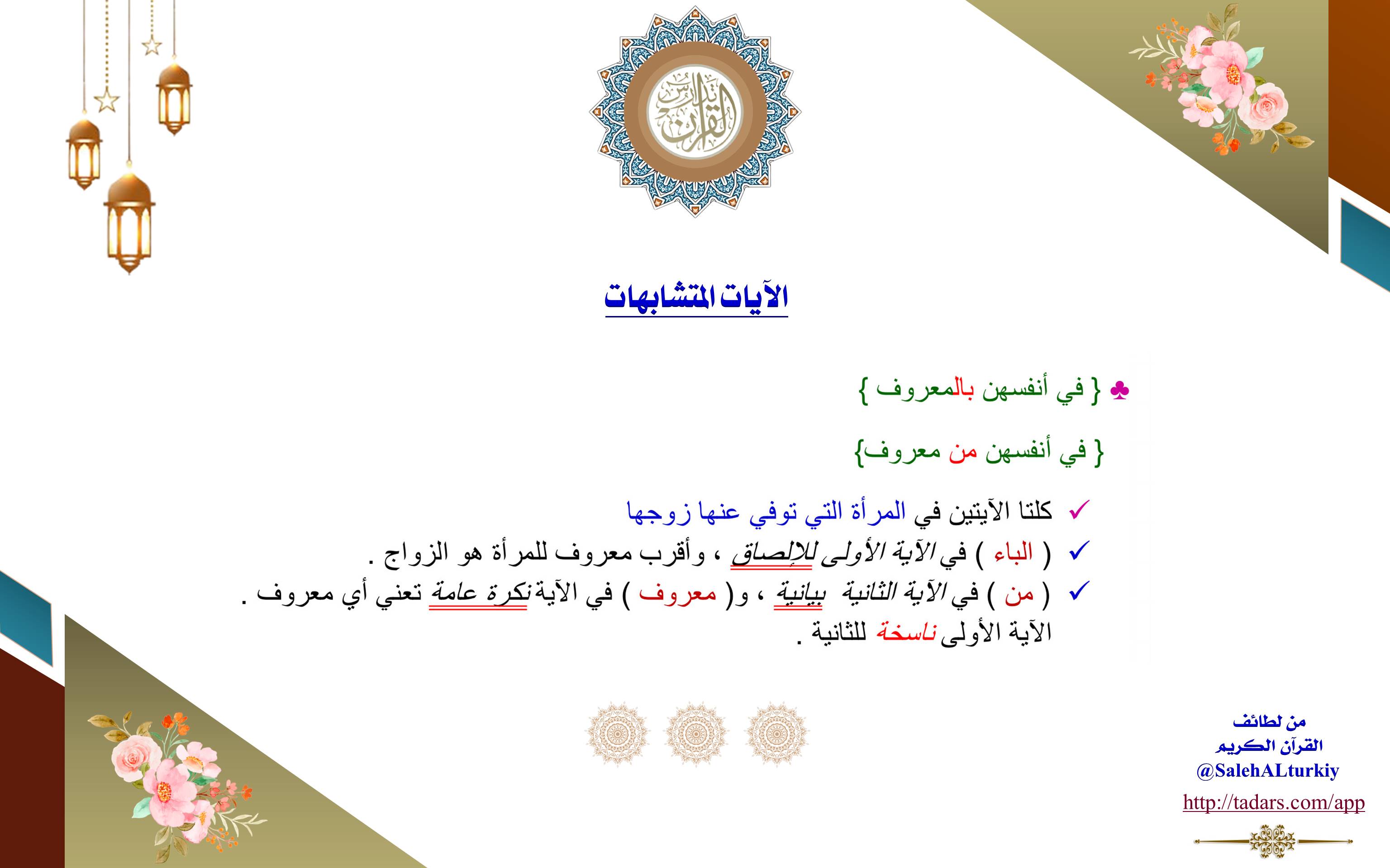 - ﴿وَالَّذِينَ يُتَوَفَّوْنَ مِنكُمْ وَيَذَرُونَ أَزْوَاجًا يَتَرَبَّصْنَ بِأَنفُسِهِنَّ أَرْبَعَةَ أَشْهُرٍ وَعَشْرًا فَإِذَا بَلَغْنَ أَجَلَهُنَّ فَلَا جُنَاحَ عَلَيْكُمْ فِيمَا فَعَلْنَ فِي أَنفُسِهِنَّ بِالْمَعْرُوفِ وَاللَّهُ بِمَا تَعْمَلُونَ خَبِيرٌ ﴿٢٣٤﴾ ﴾ [البقرة آية:٢٣٤]