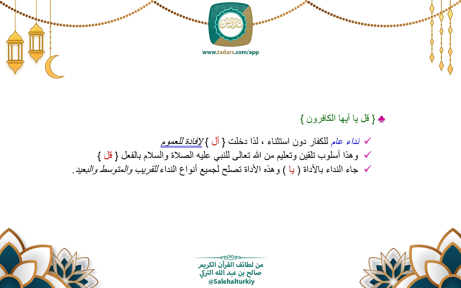 • جاء النداء بالأداة ( يا ) وهذه الأداة تصلح لجميع أنواع النداء للقريب والمتوسط والبعيد.