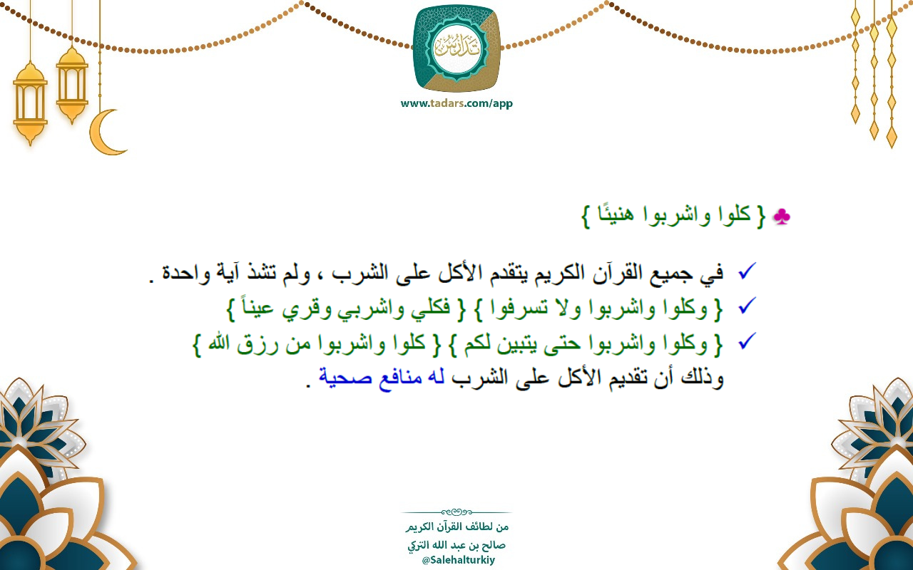 في جميع القرآن الكريم يتقدم الأكل على الشرب ، ولم تشذ آية واحدة .