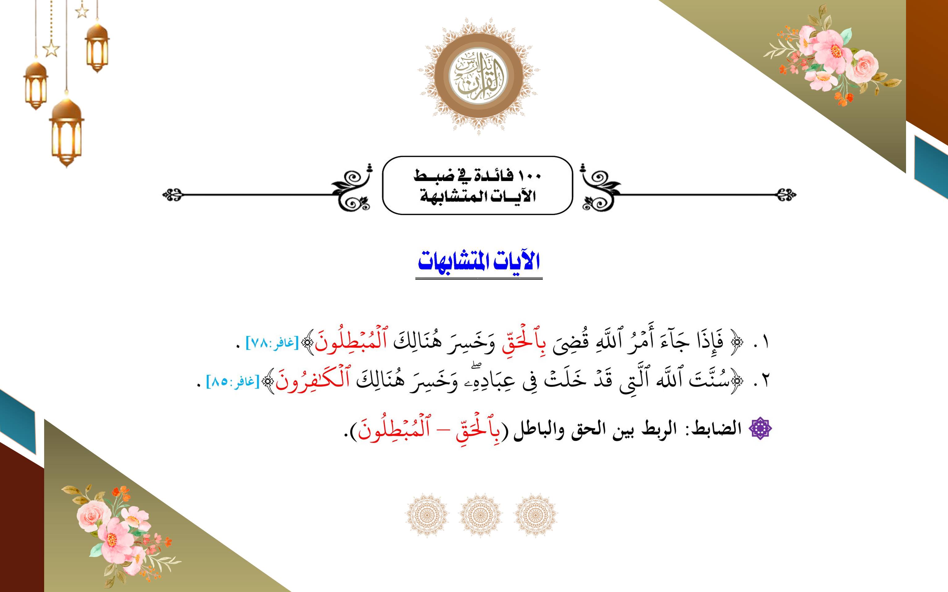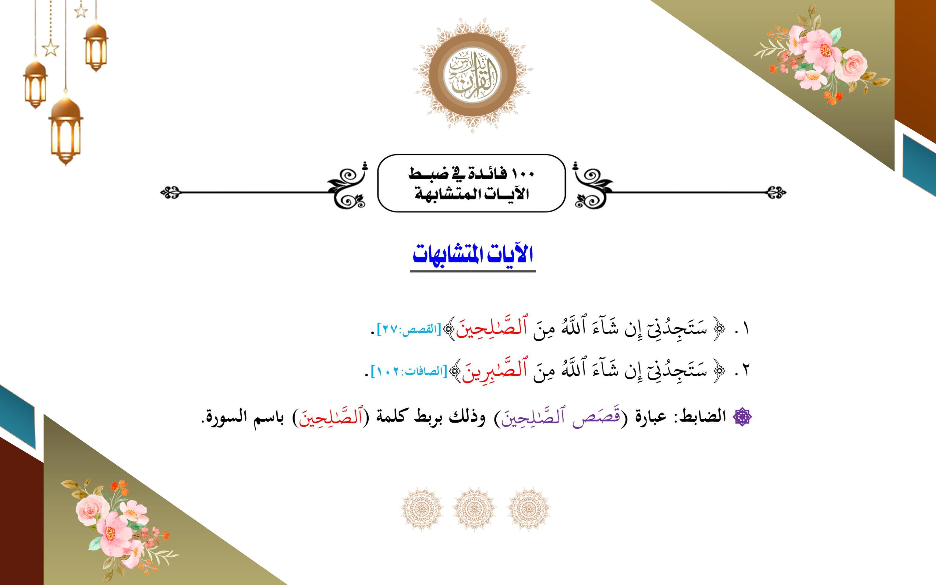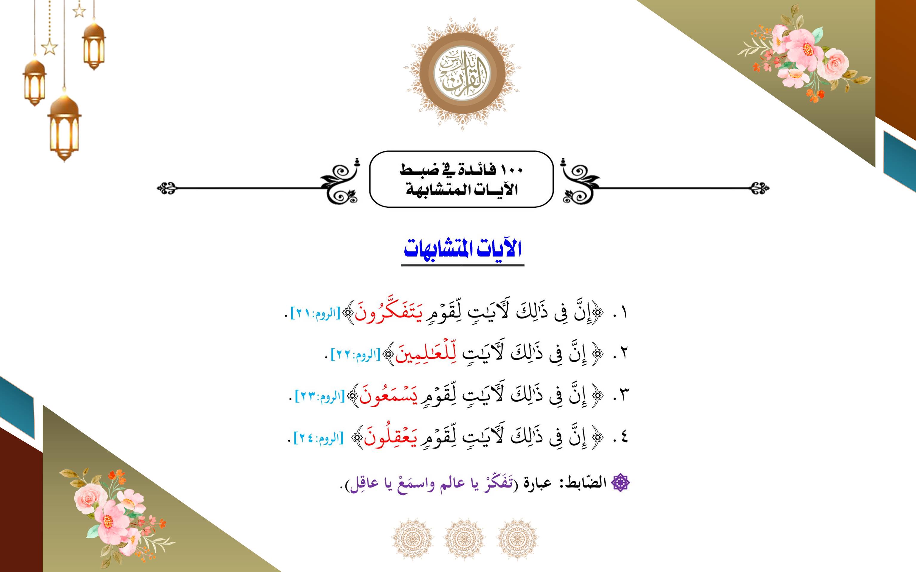 • (الضّابط): عبارة: (اعدِل يا عالم وتَذكّر يا مشرك الصّدق) وهي حسب ترتيب نهاية الآيات.