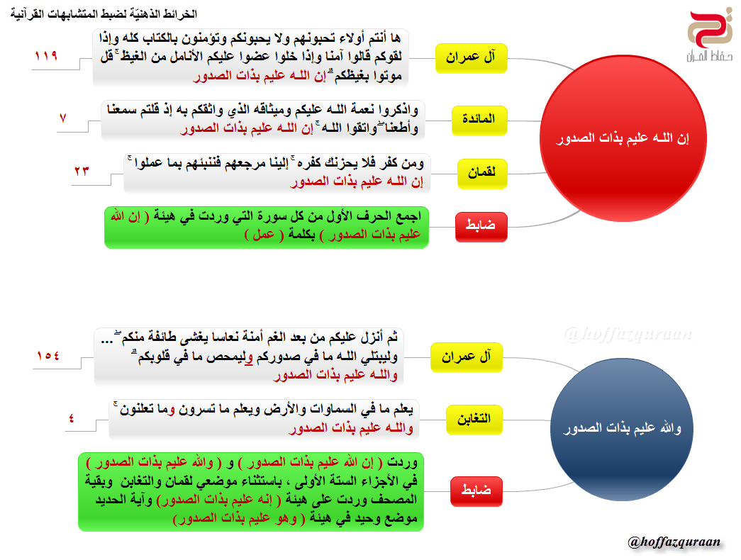 ▪ (الضابط): من الجزء العاشر إلى نهاية المصحف ورد في هيئة (إنه عليم بذات الصدور) ما عدا: سورة لقمان والتغابن، وآية الحديد الوحيدة في هيئة (وهو عليم بذات الصدور).