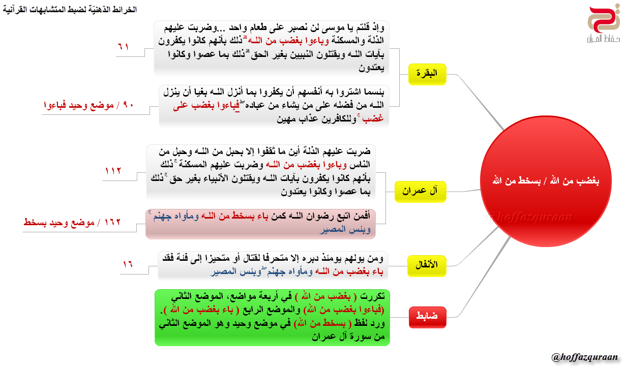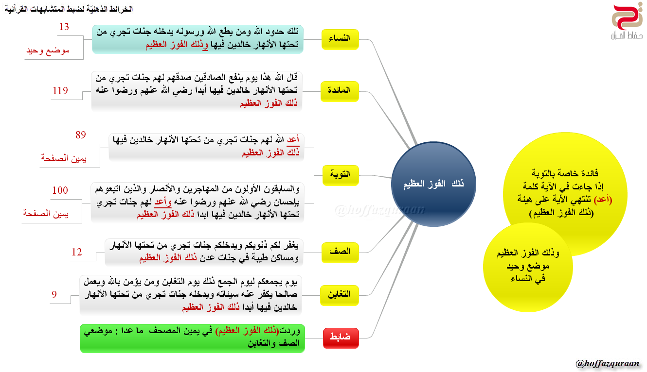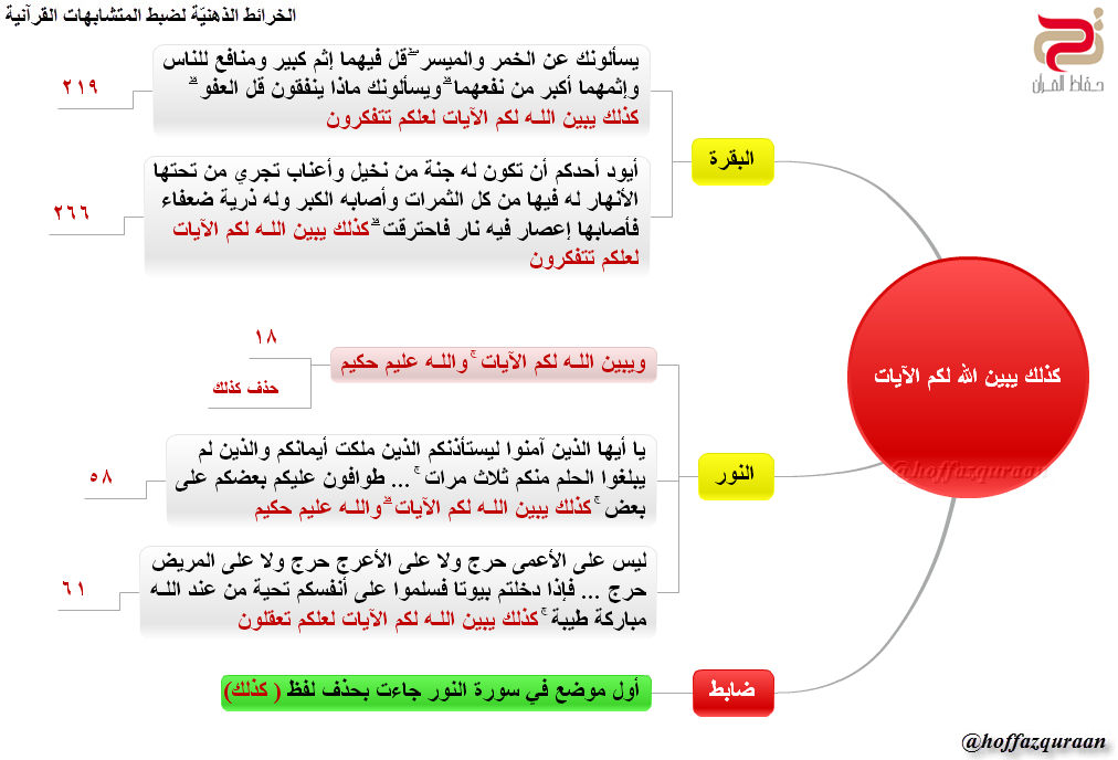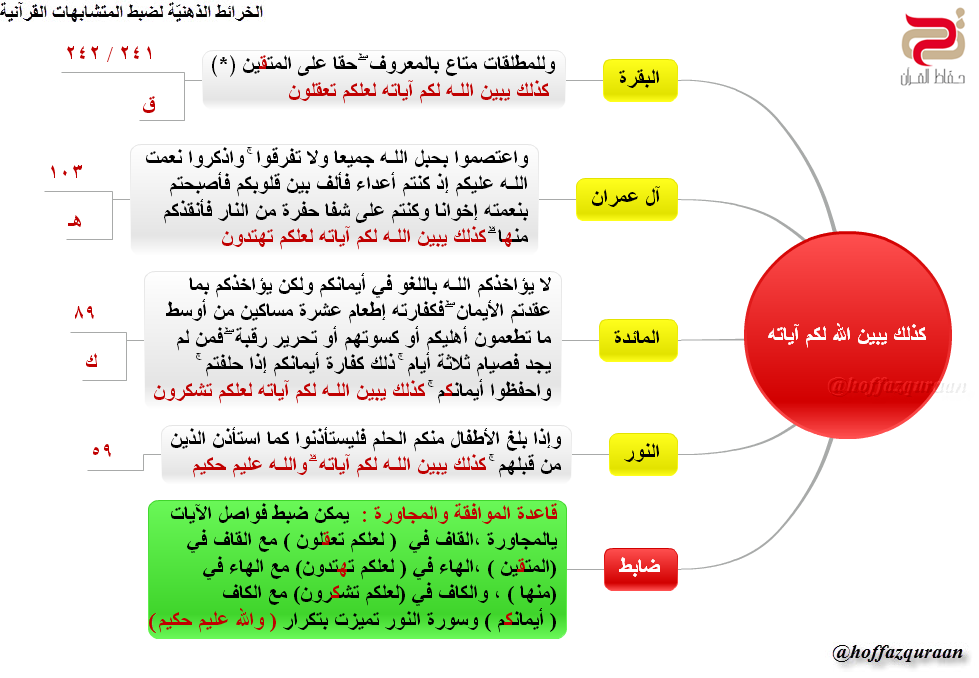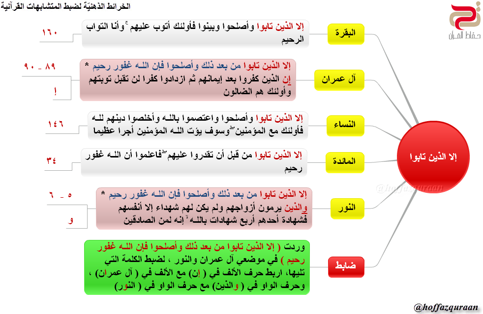 ▪ (الضابط): وردت (إلا الذين تابوا من بعد ذلك وأصلحوا فإن الله غفور رحيم) في موضعي آل عمران والنور، لضبط الكلمة التي تليها، اربط حرف الألف في (إن) مع الألف في (آل عمران)، وحرف الواو في (والذين) مع حرف الواو في (النور).
