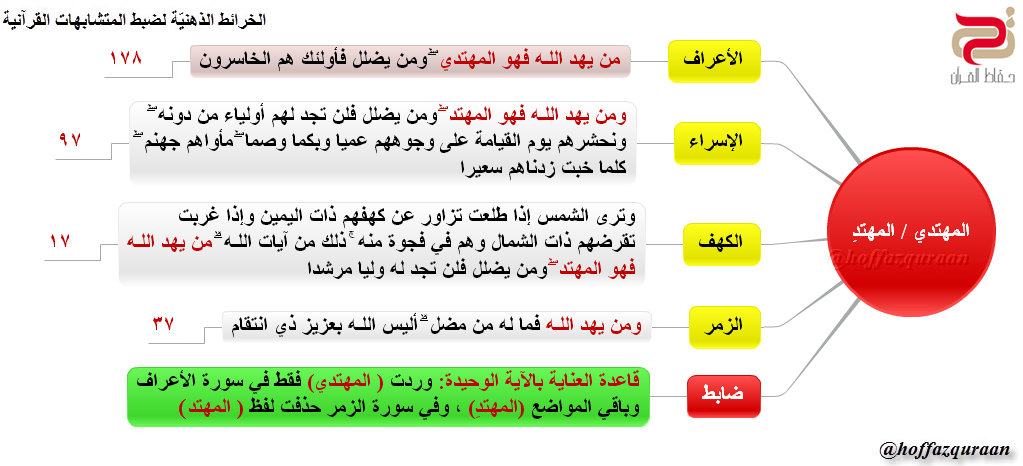 ▪ (الضابط): قاعدة (العناية بالآية الوحيدة): وردت (المهتدي) فقط في سورة الأعراف وباقي المواضع (المهتد)، وفي سورة الزمر حذفت لفظ (المهتد).